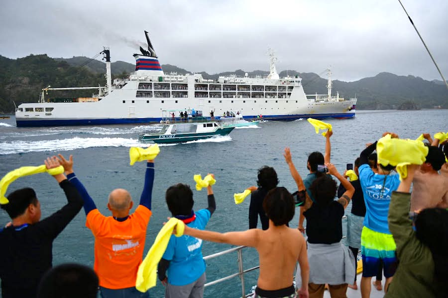 4月4日15時、「おがさわら丸」は東京・竹芝桟橋に向けて出港した。私はもう少しだけ父島に残るため、ダイビングボートにて、Mさんをお見送りした。父島では、二見港を出港する「おがさわら丸」にボートが伴走して「いってらっしゃい」と叫び、海に飛び込む伝統行事がある。