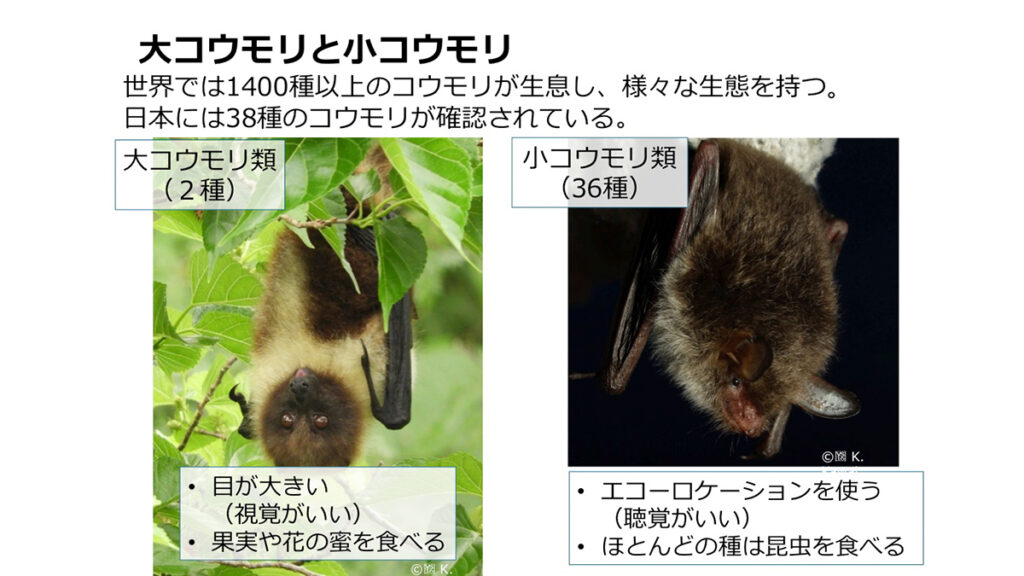 コウモリには体が大きく、目も大きくて吻[くちさき]が犬やキツネのように出ている比較的大きな大コウモリと、体が小さくてネズミみたいな顔をしている小コウモリがいます。世界には1400種以上のコウモリが生息していて、日本では大コウモリが2種、小コウモリが36種確認されています。昨年、新たに1種見つかったため、小コウモリは37種と言っている人もいます。