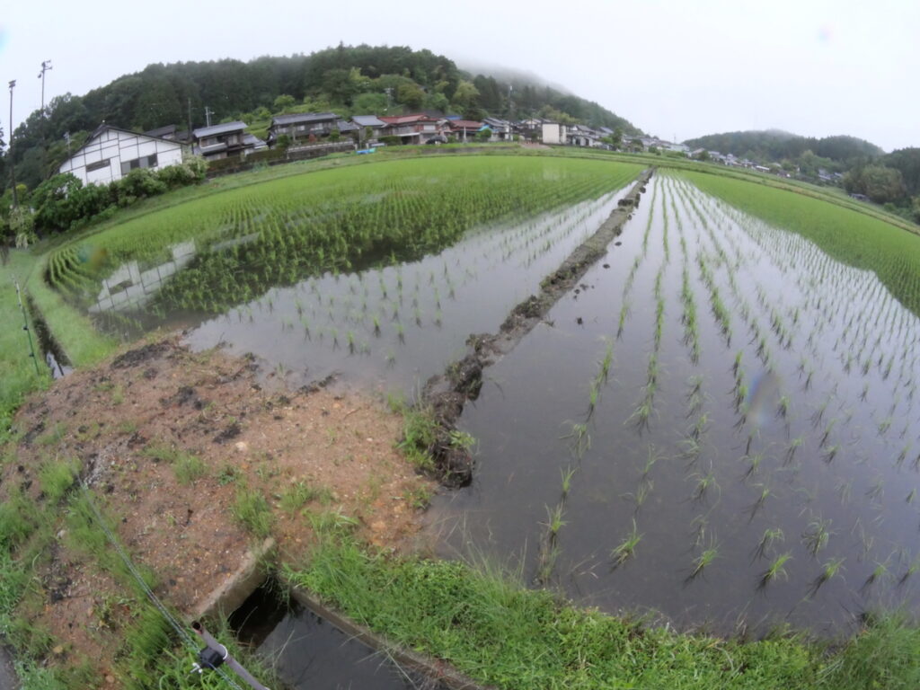 隣接する田んぼでは、建物側に水が寄りすぎることから、水をせき止めるための畔(写真真ん中)を急ごしらえしていた