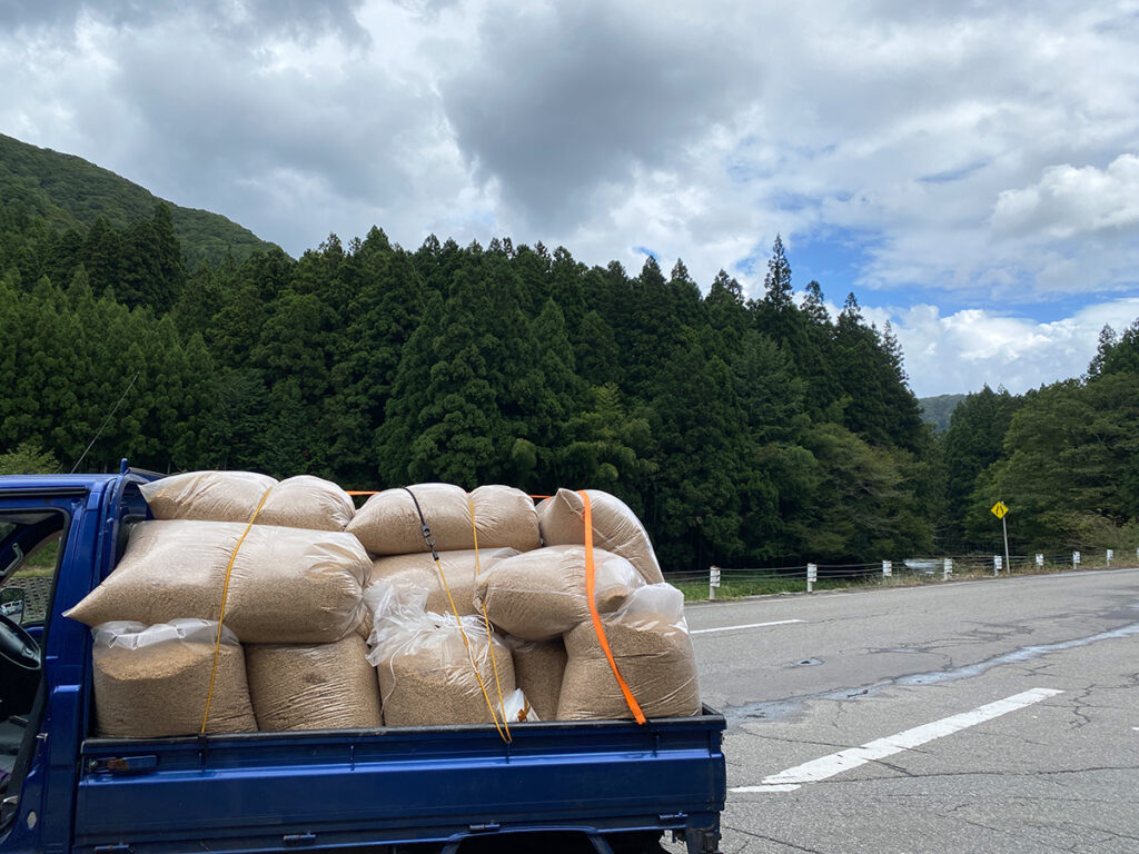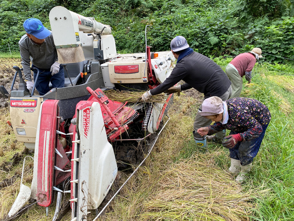 なんでこうなったか。まず、稲刈りシーズン真っ只中で乾燥籾摺り所の予定は埋まっているなか、前の人の乾燥が早く進み、機械が空いた。局部的な雨を降らす天気が続き、天気予報もコロコロ変わる。そして今年の作を見て、夫はできるだけ早く刈ったほうがいいと焦っていたから、作付面積の小さい我が家ならこの隙を利用できるのでは、と乾燥所の主人が急遽提案してくれたのだった。さらに土曜日とあって、たまたま脱穀所に顔を出した村人が稲刈りを聞きつけたり、仕事を融通させて急いで来てくれたり、まるで救急車対応のように緊急事態さながら集まってくれた。いつまた雨が落ちてくるかわからない。その緊張感のまま、ダダダと稲刈りは終わったのだった。