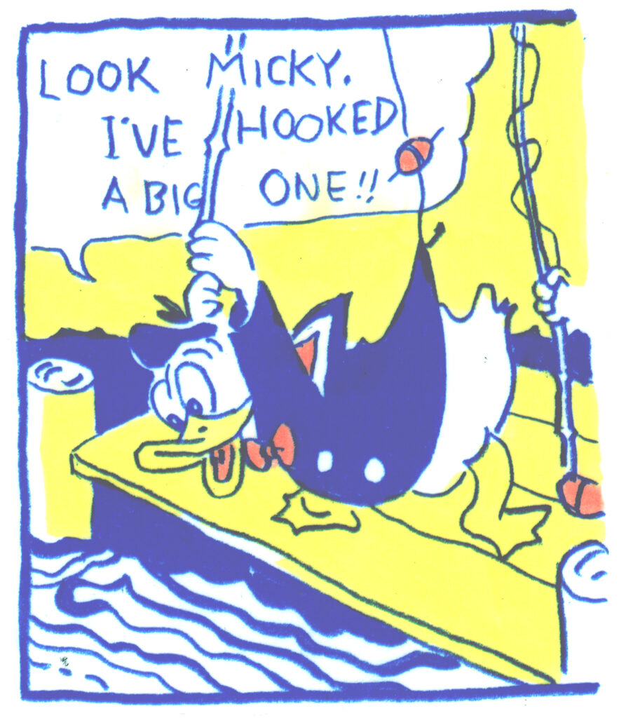 1960年時点のリキテンスタインの作品をすべてチェックしたわけじゃないですが、この時点で最も有名なのは〈見て、ミッキー〉っていうドナルド・ダックが、自分の釣り針を上着の裾にひっかけて、大物が釣れたと思い込んでるっていう、ディズニーのマンガを絵にしたヤツです。