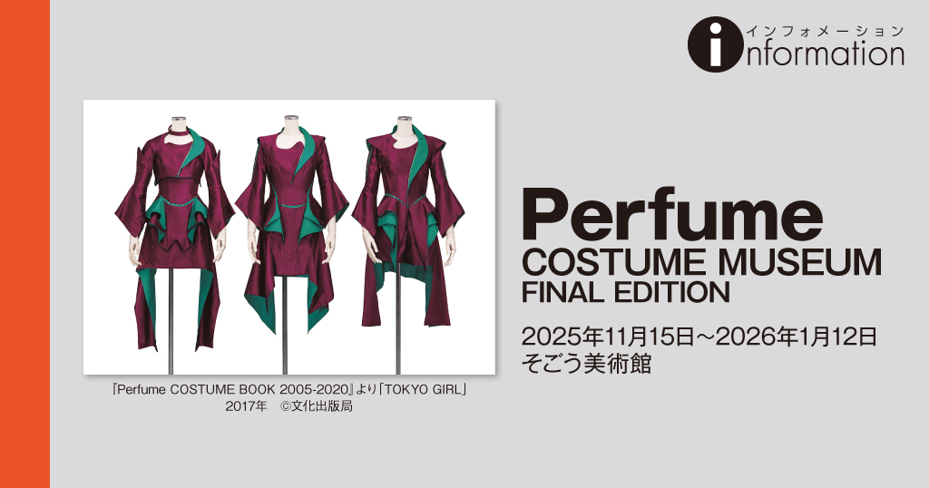 ときに数万人の観衆の前に立つ、あ~ちゃん、かしゆか、のっちの3人に寄り添い、たくさんの挑戦や喜びをともにしてきたのが、美しく独創的な衣装の数々。本展は『Perfume COSTUME BOOK 2005-2020』(文化出版局、2020年)を起点に、メジャーデビュー以降の選りすぐりの衣装を紹介する大規模衣装展として、2023年から全国を巡回してきた。