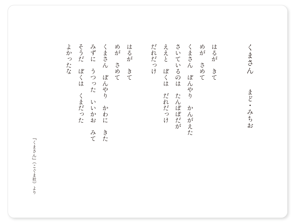 まど・みちお作詞の童謡「ぞうさん」と同じく、この「くまさん」という詩にも、実はメロディがついていて、童謡としても知られている。ソプラノの声ではなくて、地声で歌いたくなる曲調で、読んでいるうちに、自分の声が、詩と歌のはざまをさまようのを感じる。