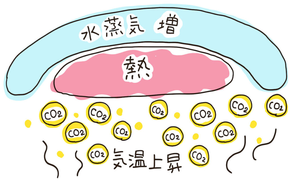 「うん。気温が上がると、水蒸気が増えるせいもある。水蒸気って、実は地球でいちばん強い温室効果ガスなんだ。空に広がって熱を包みこむ。CO₂が増える→気温が上がる→水蒸気が増える→さらに熱を閉じこめる。このくり返し」