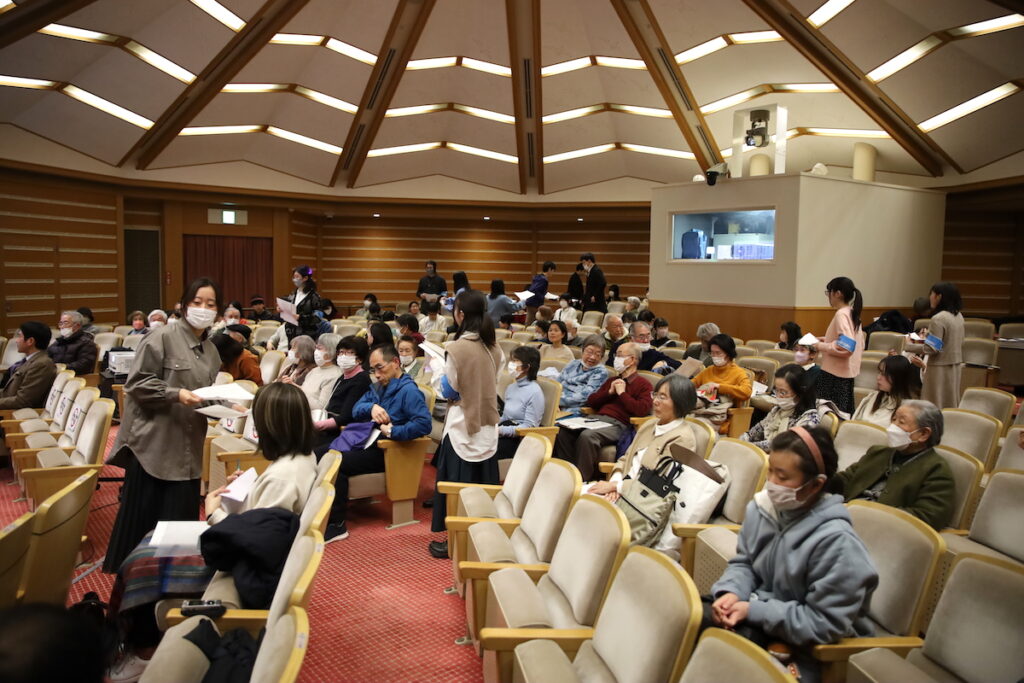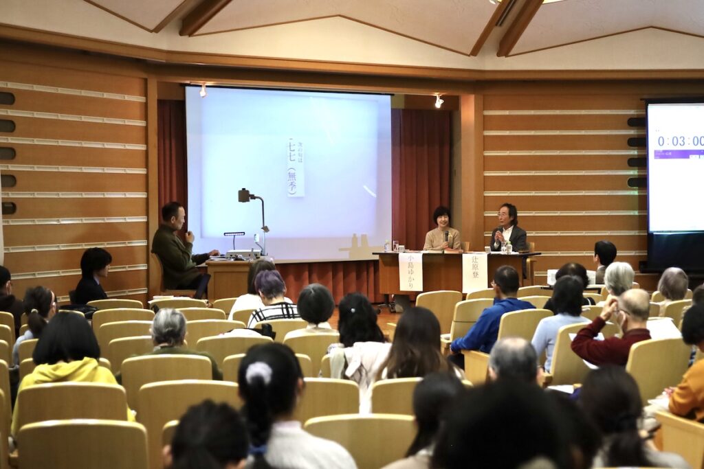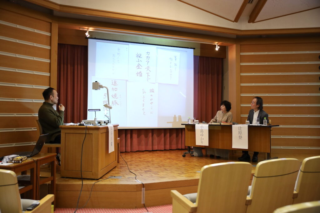 (十句目は参加者からの事前投句を集め、十一句目以降は会場での投句を元に選考されました。投句では前句につけるのにふさわしい句を制限時間(3分)内で考え、短冊に記入して提出。その中から長谷川さんが選んだ候補がスクリーンに映し出され、辻原さんと小島さんが加わって選考が行われました。連句会の進行には、東海大学文化社会学部文芸創作学科の学生たちが協力しました)