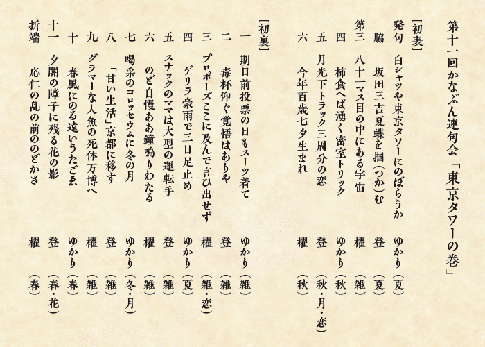 長谷川 今年もまた皆さんと、楽しく半歌仙を巻くことができました。これで「東京タワーの巻」が巻き上がりました。例年は、ここでお開きになりますが、最後にもう一つの「東京タワーの巻」をご覧いただければと思います。これは我々で巻いたものになります。メンバーが変わるとどれほど変わるか、それぞれの作品として見ていただければと思います。