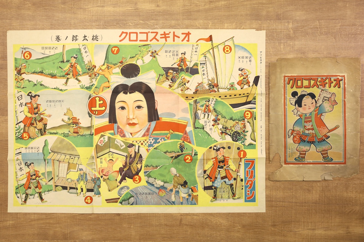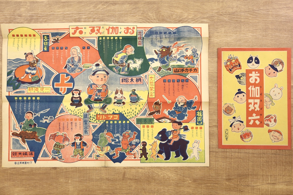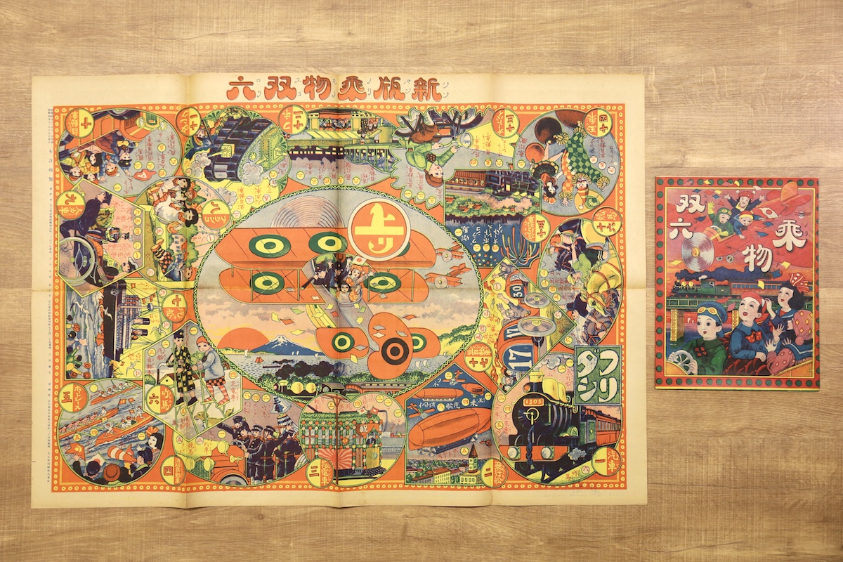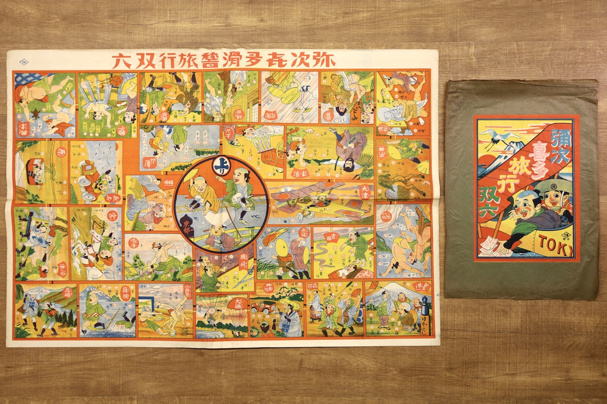 今回紹介する絵双六と袋は、明治時代から大正、昭和戦前期にかけてのものである。一部の絵双六は伝統的な木版で刷られているが、多くは近代的な平版印刷を用いて洋紙に刷られている。