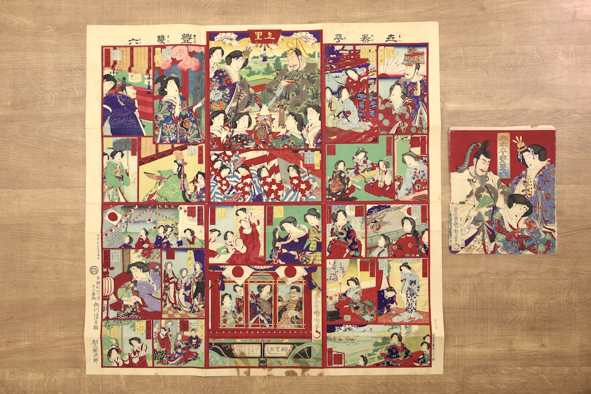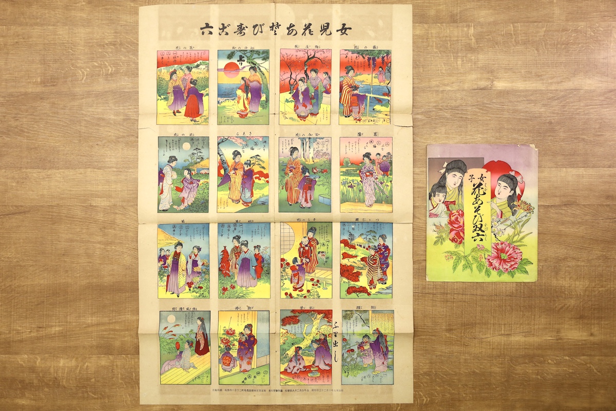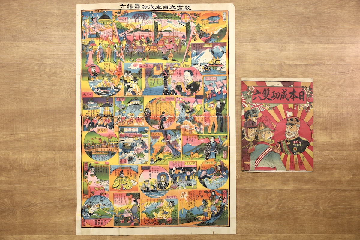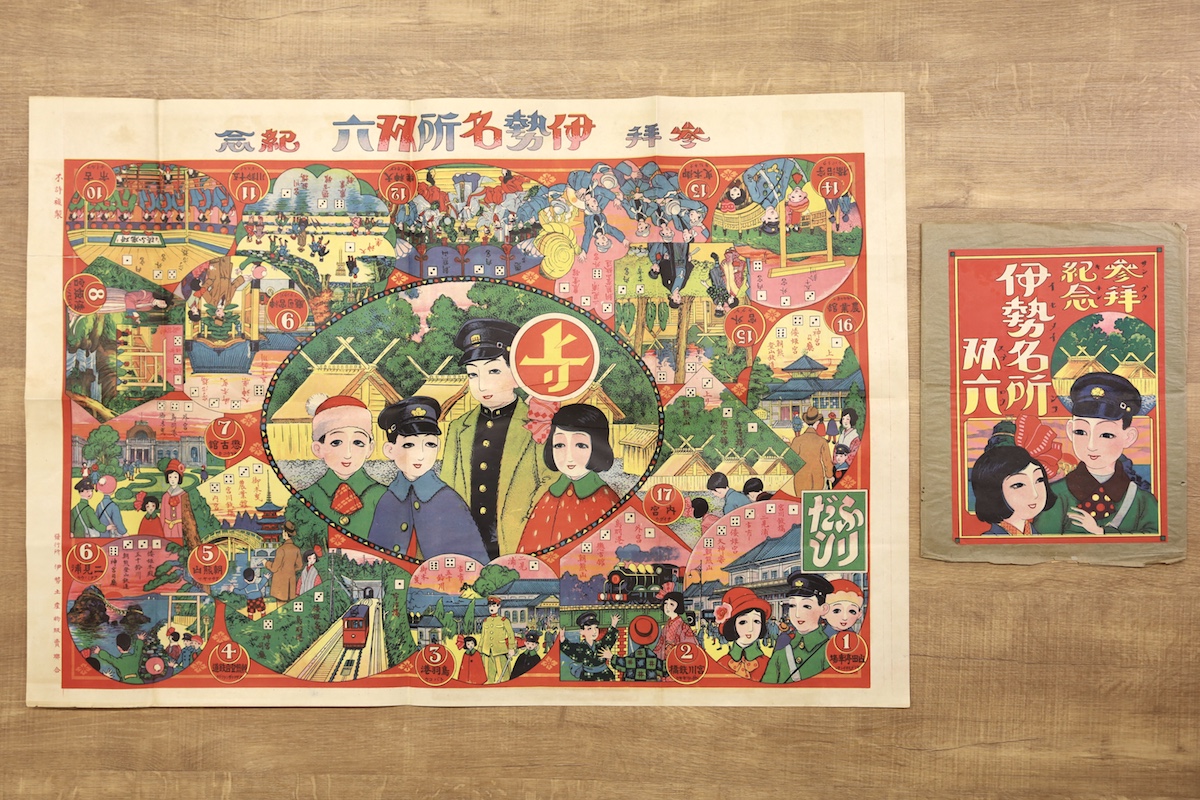 今回紹介する絵双六と袋は、明治時代から大正、昭和戦前期にかけてのものである。一部の絵双六は伝統的な木版で刷られているが、多くは近代的な平版印刷を用いて洋紙に刷られている。