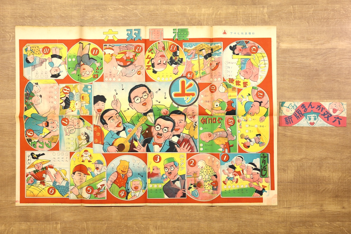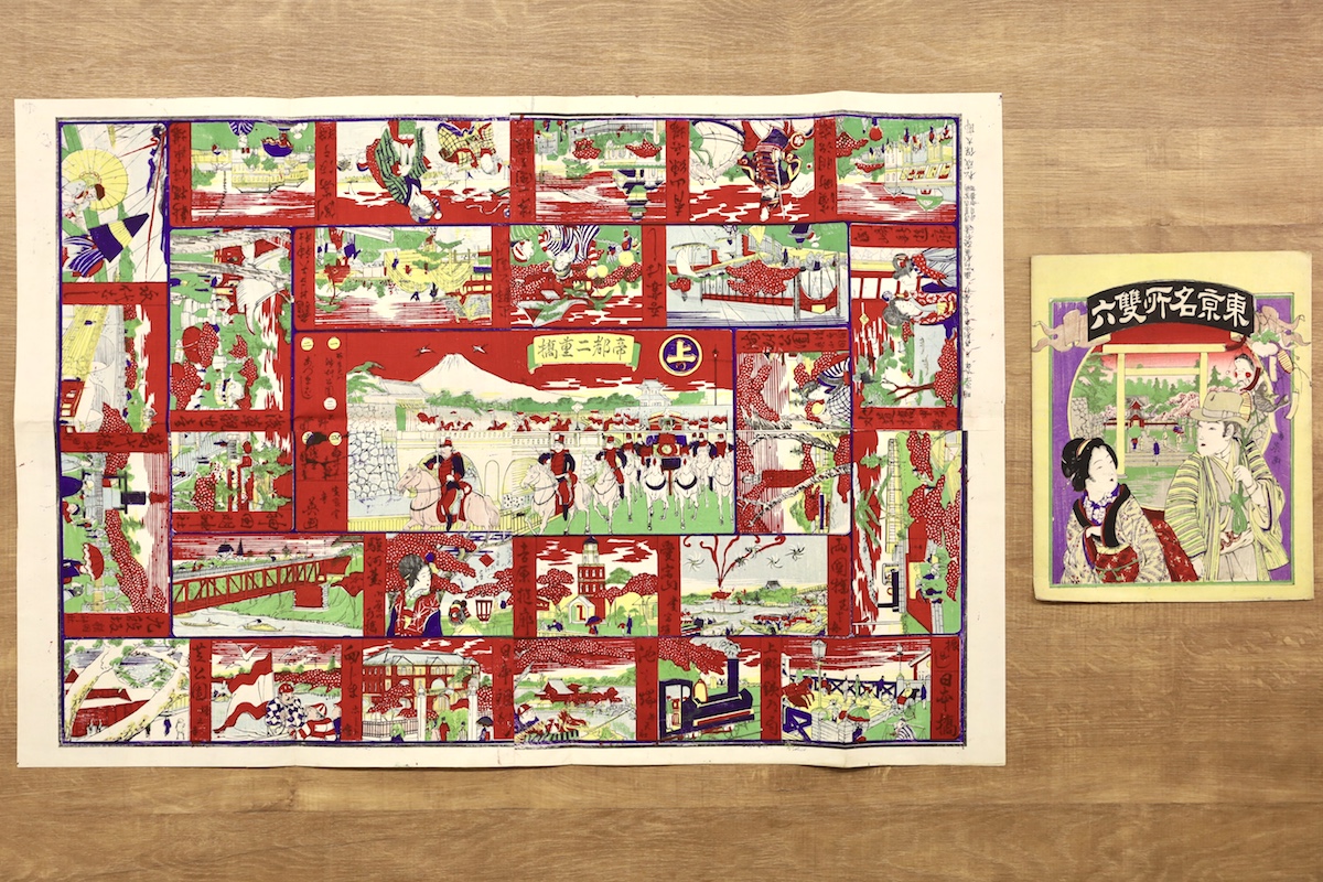 東京の名所をめぐるもの、幕末から維新、明治時代までの出来事を題材にしたもの、ラジオ放送と映画のコメディアンの似顔絵を配した双六など、テーマは時代と共に変遷していっているが、盤面のマス目の位置といった絵双六の基本的な構造は、江戸時代から大きく変わっていないことが興味深い。