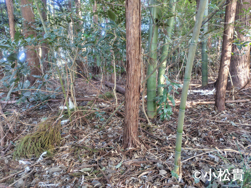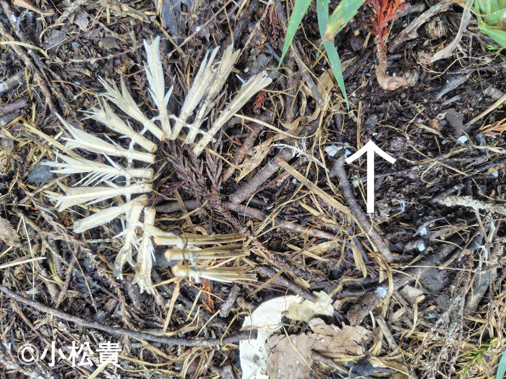 さて、仕掛けたブツはどこだろうか。探そうとしたが、このひと月余りの高温とふんだんなる降水により、林床の雑草があまりにも育ちすぎており、仕掛けの所在を探すのに一苦労した。しかも、ようやくその場所を見つけ出すも、何やら様子がおかしい。忌々しい獣の類に仕掛けを荒らされたようで、神器のうち毛髪と爪が綺麗さっぱり消えてしまっていた。あんな栄養もなさげな物、まさか食ったのか?