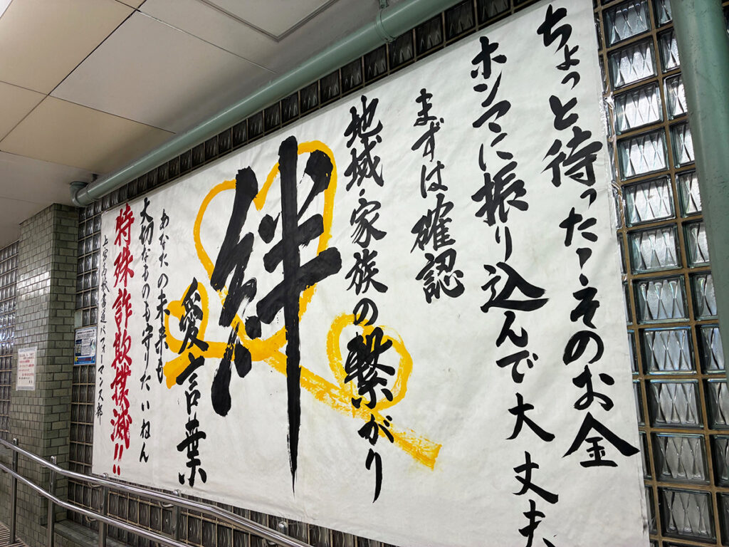 「ちょっと待った!そのお金 ホンマに振り込んで大丈夫 まずは確認 地域・家族の繋がり」と「絆 愛言葉」の右側にあって、その左に目を移すと「あなたの未来も 大切なものも守りたいねん」、そして赤い文字で「特殊詐欺撲滅‼」。要するに「特殊詐欺」被害を警告する意見広告であった。筆文字なのは「上宮高校書道パフォーマンス部」の制作だから。