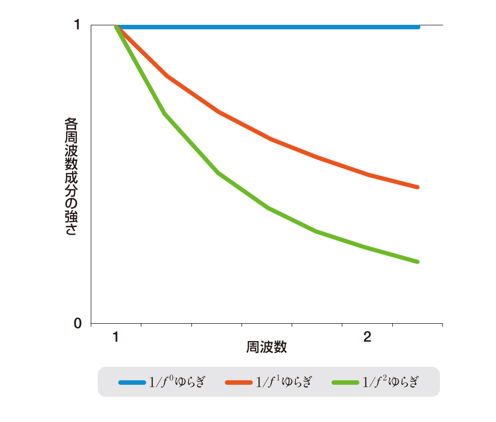 1/f 0 ゆらぎが完全にランダムで目まぐるしい変化であり、次どうなるか分からないという意味で「意外性」をもつのに対し、1/f 2 ゆらぎは、酔っ払いの歩みのように方向は定まらないけど動きは一歩ずつであり、次どの辺りにいるかはだいたい分かるという意味で「期待性」を有しています。そして、それら両極端の中間に位置するのが1/f ゆらぎで、私たちの感覚に対しては、期待性と意外性が混じり合った適度な刺激になるとも言われています。