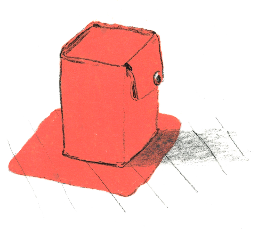 一斗缶っていうのか、よく灯油なんかの入った四角い缶、おそらく業務用のペンキなんかが、この缶で売ってたんだと思うけど、まっ赤なペンキが入ってるのが、フタあけたら溢れちゃいました。みたいな「状態」。