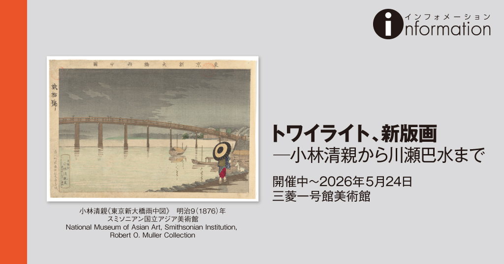 本展では、小林清親から新版画を手掛けた吉田博、伊東深水、川瀬巴水らに至る風景版画の流れを、スミソニアン国立アジア美術館のミュラー・コレクションによってたどる。